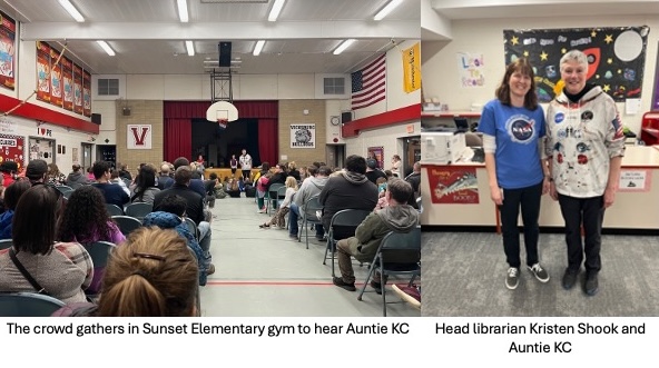 March found Kathy on the road. She gave a talk in Brighton and back to AA the next week for our Christian School. These would take form as a talk based on her books followed by sales of those books. This model seemed to work, as she’d end up making 10 more stops (some twice): Vicksburg, Saline, Pinckney, Brighton, Manchester, Caledonia, Indianapolis. The mid-March trip to the ‘burg, to address “Family Literacy Night” would be our first of 4 visits there this year. She addressed assemblies at all 3 elementary schools and then held forth at the evening’s book bazaar. Her hostess, head librarian Kristen Shook, is daughter-in-law to Joe, my dear friend and classmate who died young in a car crash.