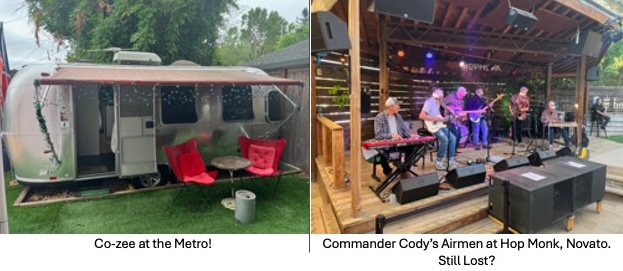 Maybe that hop switched on the band chasing mode, as a week after the 4th, we were off to San Jose, thence to Petaluma, home of my Barnes buddy Dave and close to Saturday’s destination. We stayed at the Metro, a French inspired hotel right downtown. The place is compact, but they have a shiny way of making extra room. Friday in Petaluma means the “Safety Meeting” in the back room of Maselli’s hardware; at these meetings, which start promptly at 5:15 PM, Dave and like-minded locals hold forth on the issues of the day while consuming various nutrients and intoxicants. Hop Monk of Novato was just 20 minutes south on 101, and it was there on Saturday that Bill Kirchen drew the boys together, now known as “Commander Cody’s Lost Planet Airmen”. The ol’ Commander ascended to the outer ozone 4 Septembers ago, but 6 of the remaining 7 Airmen are still alive, and 5 get together and play several times a year. They even cut a new record 2 years ago (15). They were excellent, as always, and it was good to drag Dave there to see them. Kathy even sold a few books to Kirchen’s wife, Louise. Hey, she’s a grandma too!