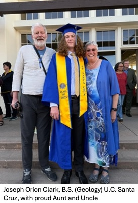 With June came Orion’s turn. His time as a banana slug (UC Santa Cruz) ran into COVID followed by local rents that turned him into a commuter student, taking the 40-minute drive from Pescadaro each day whenever he had to be on campus. But it worked out. He found a concentration he liked (geology), a girlfriend who can fix his cars, and – in the campus – an appreciative performance space for his ukelele recitals. He wants to be a “Geotech consultant”, with duties which include localizing and timing the next earthquakes.