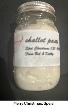 My dad passed to all his kids that they should approach each meal as if it were their last, and his spawn honors that legacy by cooking up a storm. I’ve finally learned the men’s dress code: flannel shirt – unbuttoned – with a plastic fork in the front pocket, ready to stab whatever goodie might present itself. Some prepare foodie gifts for distribution. From us this year was shallot paste, a handy item to have in the kitchen.