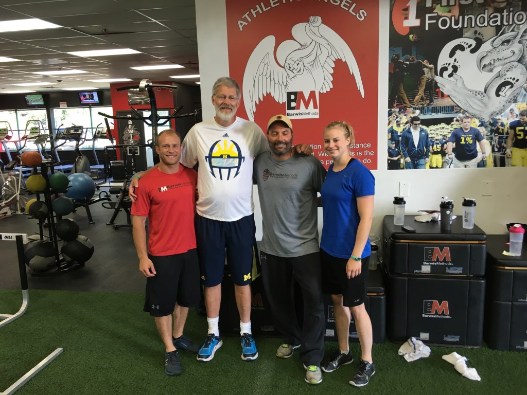 Two days before Christmas ’14, braking to avoid a Chilean weiner dog while rolling down a potted hill threw me into a ditch where the landing fractured and dislocated my shoulder while bruising my brachial plexus. I found ways to practice without a right arm and within 6 months I was managing to do most everything I’d done before. But dexterity and strength were slow in coming. By February ’16 I was sufficiently frustrated with UofM’s therapists to seek help elsewhere, with crazy Mike Barwis, strength and conditioning coach for Rich Rodriguez’ Michigan football team. His shop in Plymouth – Barwis Methods – drew pro and amateur athletes from around to country for his rigorous and unorthodox programs. Civilians like me came too, manly “weekend warriors” nursing an injury or just seeking to up their game. I guess wrecking a shoulder biking counts as a sports injury. I knew they wouldn’t coddle me, and my trainers Mike and Sara didn’t. By August, my arm and hand were 90% as good as before the accident. I was pleased. Here’s the team that did it.