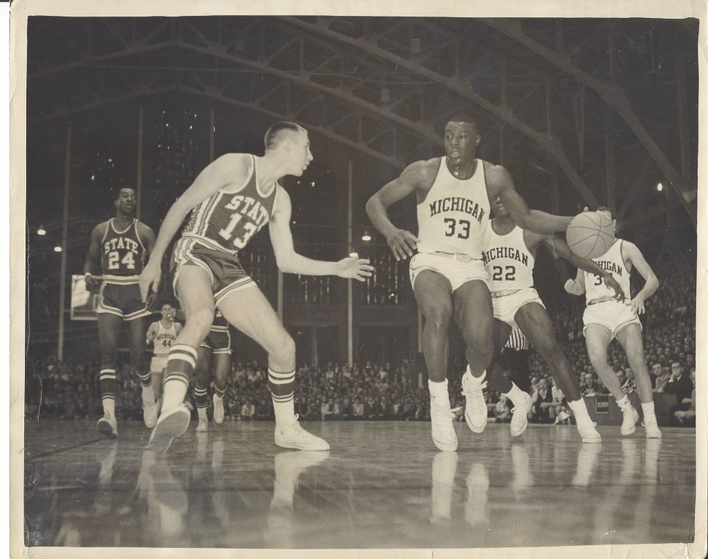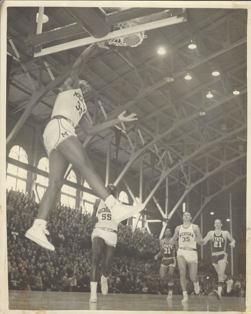 So I remember it pretty well now. The Pistons came to Kalamazoo (I forget the venue) to play an exhibition against the Knicks. Had to be fall of ’67. Cazzie Russell was playing for the Knicks and he was the star attraction for us. Cazzie transformed Michigan basketball when he came here from Chicago’s Carver High in ‘63. Tall, strong fast with incredible hands, he provided joy every time he touched the ball. A Cazzie steal followed by a full court race to the bucket where he smashed it through was a thing of release for this skinny teenager as well as most everyone else lucky enough to be watching. He took the star-laden Wolverines to final fours in ’64 and ’65, but never grabbed the brass ring, falling to Duke in the ’64 semis then getting oh so close the year later smashing Bill Bradley’s Princeton only to fall to John Wooden’s smooth Gail Goodrich-led UCLA Bruins. In ’66 he couldn’t get the team past Kentucky in the regionals but was named College Basketball Player of the Year. Cazzie’s legacy at Michigan extends beyond all the memories, trophies, and banners he left. The outpouring of enthusiasm and support for Cazzie’s roundballers convinced the Regents to find $7.2 million to build Crisler Arena, which opened the year after Cazzie left and will forever be known as “The House that Cazzie Built”. Cazzie was the number one overall pick in the NBA draft but never achieved pro stardom at the level he’d attained in college. He made the ’67 all-rookie team and his Knicks won the NBA championship in ’70. Golden State traded legend Jerry Lucas to get him and the next season he was an all-star. He made stops with the Lakers and the Bulls, leaving the NBA after 12 seasons, playing in minor leagues for 3 more years. He coached successfully at some small schools and was mentioned as a candidate for every U of M opening after Steve Fisher. He still stops by his “House” from time to time, always getting a warm standing ovation. So you can understand why it might be exciting to see him again up close, an opportunity the Pistons-Knicks contest provided. Dad took me and we had good seats. I had with me several 8X10 black-and-white glossies of Michigan Cazzie in action, given to me by a guy in my dad’s office. Here they are: