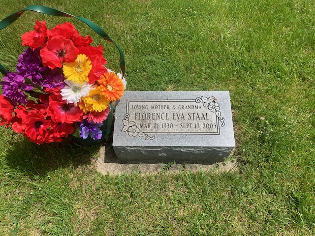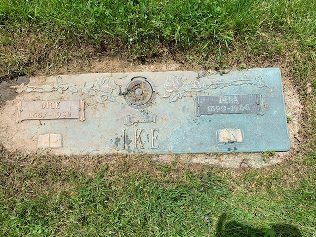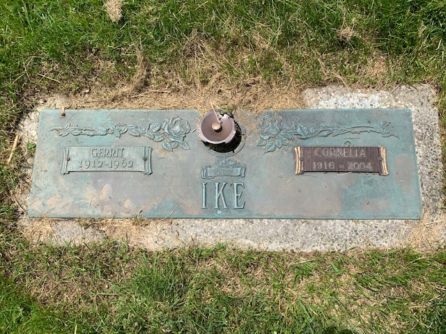 Kathy and I visited some Ikes yesterday, and a few other family. We make this trip every year around Memorial Day to decorate my mom and dad’s graves and linger by several others. Yesterday morning was beautiful with bright sunshine that made chosing the top down Jeep for the trip west a no-brainer. We kept to the back roads till we ended up at Grandville cemetery. We helped along Dad’s and Mom’s, already sporting a crisp flag from the VFW, by placing our potted red chrysanthemum, Dad’s usual, into the green pail Diane had put between the stones. She’d put her artificial flowers next to her mom’s, which will still be colorful in November when we have to pull things in. I related to Kathy that Aunt Florence was resting in the plot dad had meant for me when he bought in ’62 and she was happy I hadn’t had call to use it.