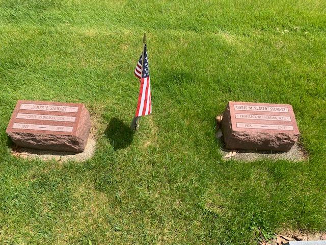 We ventured west a few rows then toward Prairie where we found the four red stones of the Slaters: Uncle Jim (Stewart, her husband), Aunt Dorie, and Grandma and Grandpa Slater.