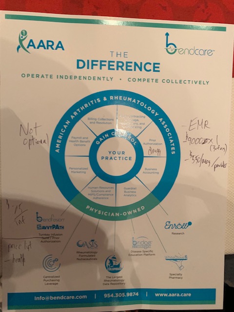 Bendcare offers all sorts of bundled services. You actually buy in by joining American Arthritis and Rheumatology Associates (AARA, don’t try to find ’em on the net), a parent corporation. Costs $3000 up front, then $550/mo. Bendcare makes most of its money on your data, which I’m too much of a boomer to understand. But they have the biggest base of patient outcomes data of anyone in the world. Must be important to somebody.