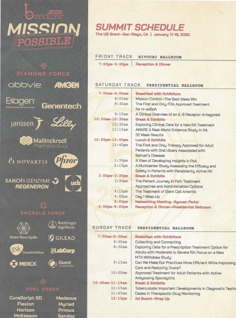 The invite came out of the blue. On a cold day in early November somebody named Michael Prondecki wants to fly me to San Diego in January and put me up at a luxury hotel to participate in the first of the year “Bendcare Summit” with 80 of my peer “top Rheumatologists” from around the country. Few other details, but there’s CME involved and he’s not asking me to talk. To San Diego in January could easily be added “my San Diego”, e.g. LaJolla, with a chance to revisit some of the fun of those 3 months Kathy and I spent there 3 winters ago on my UCSD sabbatical. I quickly emailed Ken Kalunian, my friend and UCSD host, to ask if these guys were legit. When his affirmative answer came, I could no longer sit through the ever more boring seminar at the Ford school to rush home to my computer and accept my invitation while making further flight and AirBnB plans. I’d texted Kathy during the seminar and she was all in. Turns out Prondecki had been peppering me for months with invites to other great locations. I think it was the San Diego that got my attention.