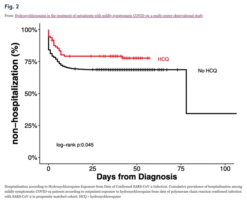 Among 1274 outpatients with documented COVID infection 7.6% were prescribed hydroxychloroquine (Plaquenil). In a 1067 patient propensity matched cohort, 21.6% with outpatient exposure to Plaquenil were hospitalized, and 31.4% without exposure were hospitalized. Propensity score matching is a quasi-experimental method in which the researcher uses statistical techniques to construct an artificial control group by matching each treated patient with a non-treated patient having similar characteristics. Using these matches, the researcher can estimate the impact of an intervention. So using these stats, they showed that the reduced rate of hospitalization for the patients who received Plaquenil was statistically significant. It looks even better graphically