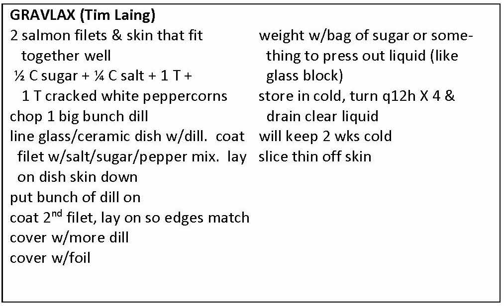 Both our wives are named Kathy, so we have that in common, in addition to each girl being a superior person to our lowly selves. Tim, like me, loves to cook. We’ve never had a head-to-head competition, but I’ve gathered from his descriptions of his own ventures, he goes a little more elegant than me. He graced us many years ago with a simple recipe that we’ve employed many times, always with great satisfaction. The recipe is for gravlax (Swedish for “buried salmon” or “salmon in a grave”), one of the many old pre-refrigeration fish recipes, like lutefisk, where fresh fish is buried with salt and other drying compounds to be preserved for eating later. The product was often vile, but beloved by generations later who have far outgrown the necessity of such a practice. The Swedish version, made in all Scandinavian countries (Kathy’s and my own Norway included) makes for a pretty tasty product. Likely, the fish was gathered just before the waters finally froze up or became too frigid to ply, with the cured product available to be munched at Christmastime. Maybe it’s attractive to rheumatologists like me and Tim as we never cure anything otherwise. At least we can do a fish. To do this right, you take a pretty big slab of salmon (recipe’s at the end), so unless you have a big Christmas crowd, there will be leftovers. Not knowing what to do with the surplus from our last batch several years ago, I vacu-sealed and froze it. The fate of that fish I the basis for the rest of the story, which I related in an e-mail to Tim: