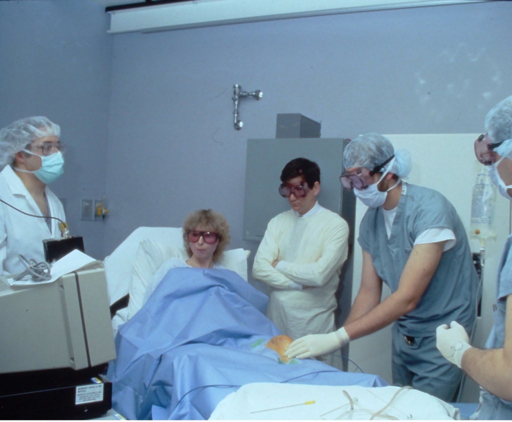 Tim has been my colleague since ’88. His Garden City MI working class upbringing has been refined though Harvard, U of M med school and residency (including a chief residency) and a San Francisco fellowship. He married a dermatologist who’s smarter, better looking , and far more successful (measured by paycheck). Both are still incredibly down to earth and good friends. Tim’s been a great colleague. We even share authorship on a paper* describing an intervention of Tim’s design. See us here in ’94 applying it to a patient. I’m the guy with the ‘scope. Tim’s leaning against the wall between me and the patient surveying it all. We’re all wearing goggles to protect against the UV light.