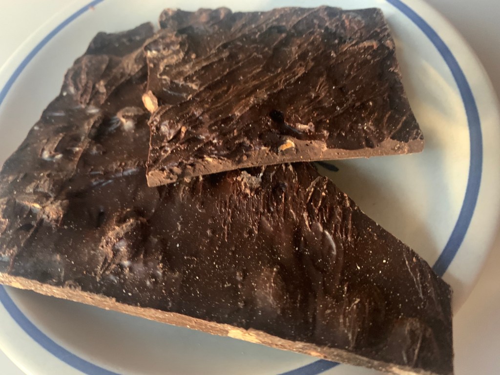 I have 2 Weber grills and a Pit Barrel smoker. I do most of my grilling on the little Go Anywhere number, with its 10X16 grate. It sits on top of my 23” kettle. But this spread would require more grill space. Fat on the steak sure makes it tasty, but oh does it feed the flames. The internal temp shot past 1350 quickly, already at well (1650) when I first measured. Had to take it off and let sit while the vegetables got done. Kathy had set the table as if normal people would be eating there, complete with place mats, steak knives, and forks. But it was all finger food to me, so we sat in our rockers and watched the sun set, surveying northwest Ann Arbor for any signs of trouble. All was quiet. Came time for dessert which usually features 2 kinds of dark chocolate: Nibbles from San Diego https://nibblechocolate.com/ and a Señor Murphy’s chocolate chili bar from Santa Fe https://www.senormurphy.com/store/detail/chocolate_bars/organic_chocolate_chile_bars_3_pack. But we’d nibbled away all the Nibbles , and our next order had yet to arrive. We still had a nice plate.