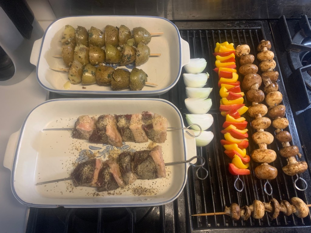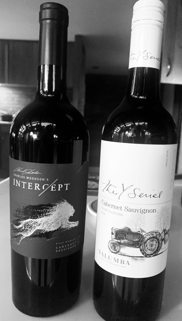 While Kathy corrected papers all morning – she’d gotten down to less than 100 for the rest of the term – I got busy prepping dinner. I’d managed to throw together everything by 1:30 when I took off for my haircut. It was pretty easy peasy. The potatoes were the most fuss. I parboiled then cooled them. I warmed ¼ C duck fat and 2 T olive oil in the same pot, threw in 2 T garlic paste and 1 t rosemary, emulsified everything, then added ½ C parsley. I threw the potatoes back in the mess and made sure everything got coated. They’ll sit in the pot till I skewered them and threw them on the grill. The recipe’s at the end. The rest were just skewered vegetables: a sweet onion and 2 peppers. Not quite ready by then were the ‘shrooms – Kathy’s favorite – which had to marinate a while before being skewered https://wordpress.com/post/theviewfromharbal.com/1238. I brought a couple nice cabs up from the cellar to wash this all down. Intercept is from Charles Woodson’s vineyard. Yes, that Charles Woodson. Both his cab and red blend are highly rated and good values. We stock upon them whenever we go to Meijer’s. The Yalumba was inexpensive and bought on a whim, curious about South Australia and liking the tractor on the label. If we do get to a second cab, we tend not to be so picky. Plus it has a screw top cap. Easier to close for later.