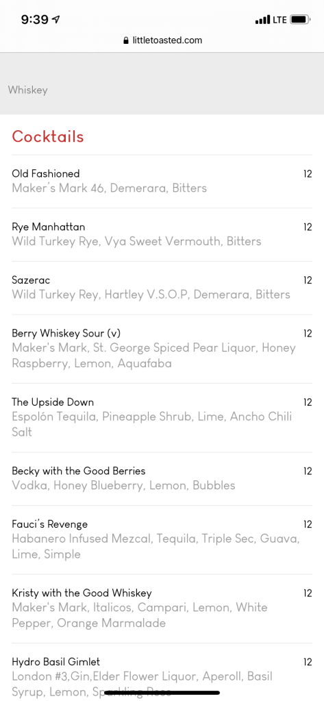 We’d tried to get into it last October during height of COVID and it was closed. We remained wary as we approached, but saw at least one person eating in the big open courtyard next to the sunken railroad yard, and the glass doors, helpfully labeled to indicate which glass panel was actually a door, let us into the big room with the big angled bar, at which were seated the Mexican owner and two helpers. He assured us they were serving breakfast, led us to our seats, and pointed out the 2 QRs, one for food, one for drinks. The had a burrito and avocado toast, which both sounded tasty, plus would whip up a bloody Mary for me and a couple mimosas for sweetheart, even though neither were on their cocktail menu, which featured fancier items.