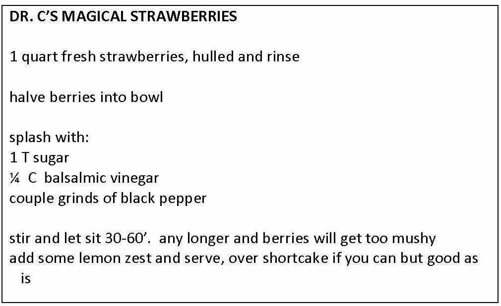 Getting there got to be a problem for my own pretty girl a couple years ago. Since she started going a little keto (not whole hog, as it were), she totally lost her sweet tooth. And this was a girl with a world class sweet tooth. Nobody I’d rather take out for ice cream. But no more, alas. And how do you get the juice out of those berries? Why, sugar, of course. Might there be another way? As we brainstormed this problem, we knew it was a simple chemistry problem. An osmotic thing. The juices moved out of the berry to sidle up to the sucrose molecules to make their concentration approximate that inside the berry itself. There must be another compound with which we could accomplish that. My girl with her 4 science degrees, 4 years as NASA’s chief scientist, and 22 years promoting knowledge at U of M went at it and quickly came up with something. In the classroom she’s Dr.C, in homage to Mr. C – the late Joe Carpenito – family friend who died young of lung cancer after many years as a superstar junior high science teacher in Orlando. The replacing agent was … balsamic vinegar! And the results were terrific! The slight tart of the vinegar complemented the natural sweet of the berries, and the juice was plentiful. Here’s the recipe we used: