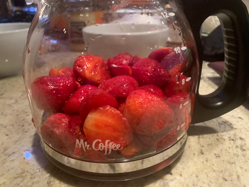 You don’t need to serve them from a Mr. Coffee pot. That’s the only glass vesseI could find in this South Haven beach house we’re renting. But not a bad look, if I do say so. Easy pouring over the shortcake.