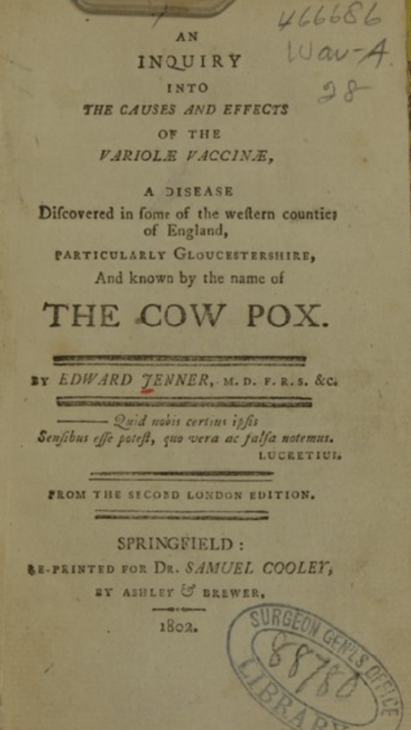 2. Jenner E. An inquiry into the causes and effects of the variolae vaccinae: a disease discovered in some of the western counties of England, particularly Gloucestershire, and known by the name of the cow pox. London: Ashely & Brewer, 1802. https://collections.nlm.nih.gov/catalog/nlm:nlmuid-2559001R-bk