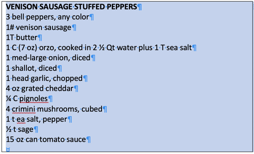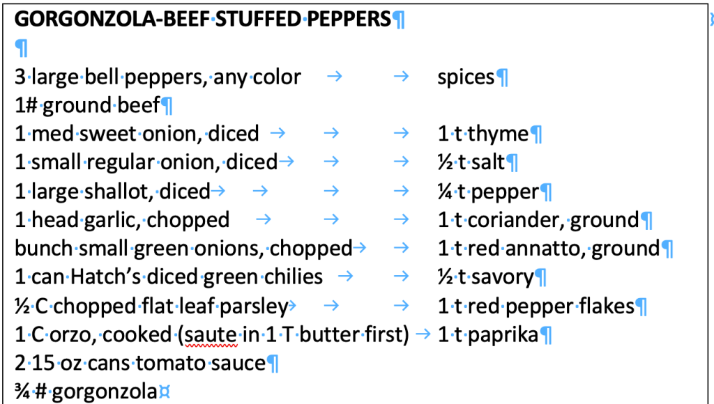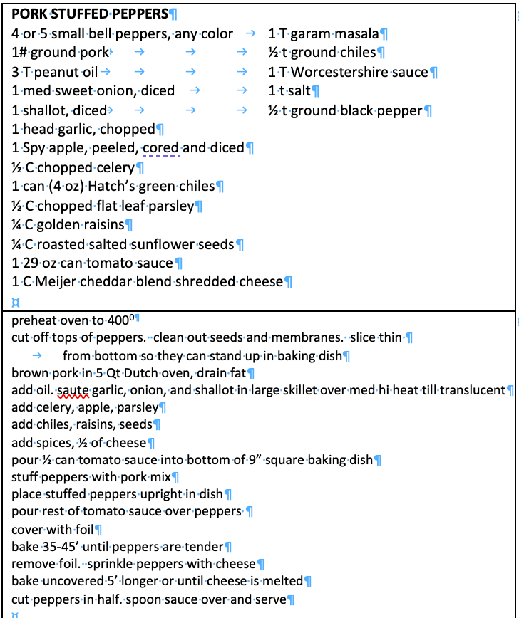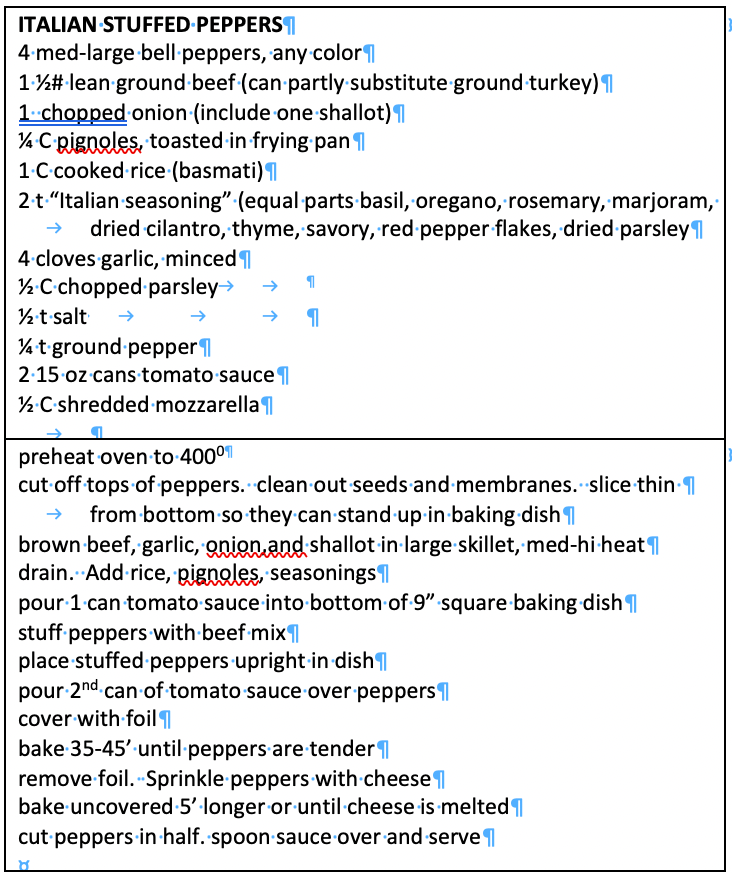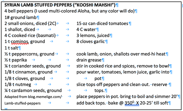 Tonight’s going to be lamb stuffed peppers. Meijer’s had a nice sale on those colorful out-of-season Mexican imports so I said what the hell. Kathy swoons whenever I say stuffed peppers will be on the menu, but I sometimes forget how good they can be. I haven’t come up with a new way to stuff Capsicum annuum for a while, but from the frenzied times when I first discovered this dish, I’ve accumulated quite a few recipes, which I share with you below. When my high school English teacher Mrs. Pharriss told me her man John enjoyed stuffed peppers, I had an envelope full of 3X5 cards off to her pronto. When I “discovered” a few more off they were to Palo Alto. She had to tell me to stop, but I think John enjoyed the peppers.