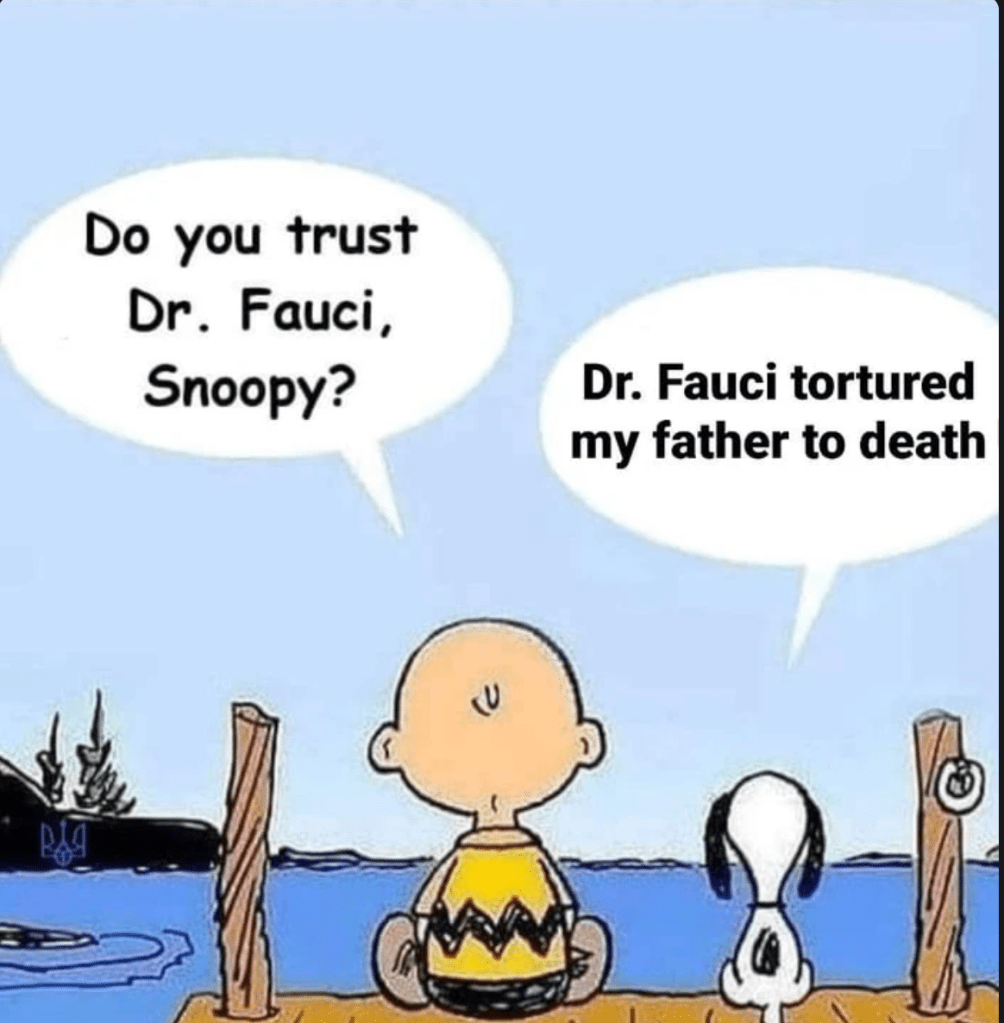 If you’re looking for a reference to bolster your “why bother” mask, good luck. What’s out there are articles that masks as part of the rest of the “mitigating measures”, like hand washing and distancing, may reduce risk. But masks just stop respiratory droplets, letting teeny Mr. Corona pass right through. Even St. Anthony privately e-mailed that they don’t do much (3). Worse comes to worse, you can buy a mask that looks like a mask but allows free passage of air and won’t fog your glasses (4). Handy for airplanes. Or you can buy a mask that makes a statement. I bought a mask a couple weeks ago with this image on it: