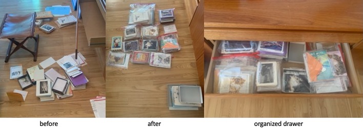 Next was fixing up the credenza drawer holding all our note cards. The bottom drops out and the cards are thrown in in hopelessly random fashion. I love writing notes in longhand and maybe once I can actually find the right card for the occasion, I’ll do more of it. It took several steps and a nap in between, but the effort paid off: