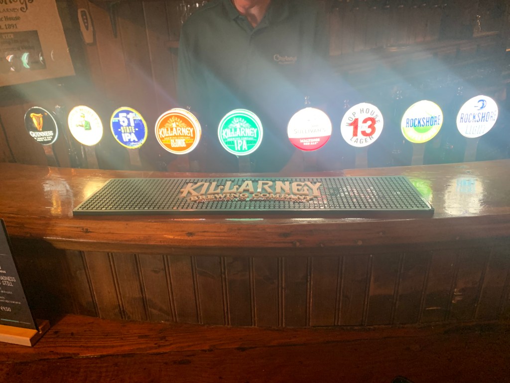 The horse carts gather conveniently near to many pubs and shops. We ventured down High Street but turned onto narrow Sráid an Phluincéid (Plunkett Street) where the entertaining pedestrian traffic continued with nary horse nor automobile. Courtney’s pub looked inviting, and indeed it was. A compact set of taps contained all you might want, including 2 fine IPAs: O’Hara’s 51st State and Kilkenny’s Full Circle IPA.
