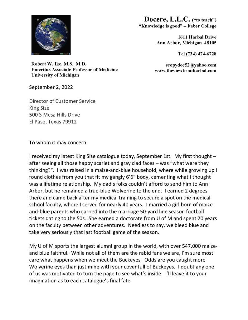 Was KingSize trying to shed the state of Michigan? I’ve been a loyal KingSize customer since my gangly teen years when no one else could fit me, except at great expense, now still buying stuff from them like loose pants of all weights that are long enough. As Americans have expanded, so have sources for big and tall stuff, but I keep going back to the originals. So why did they do this to me? I’m not one to complain to corporate, but somebody had to hear about this. Hard to do on their web page, where your choices are an 800 number or an e-mail with a little box that won’t even take 100 words. Fortunately, I found https://kingsize.pissedconsumer.com/customer-service.html, which gave their their corporate address in El Paso. King Size is part of a 14 company conglomerate, so who knows who will read what I send. See below what I sent their way.