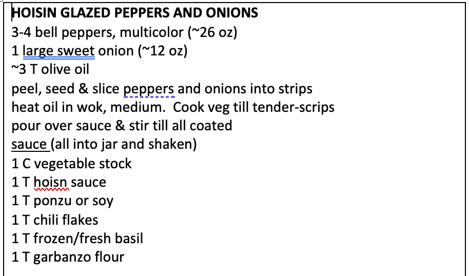 Simplest is my peppers and onions dish. I dressed ‘em up with a little hoisin/basil glaze. Recipe first, then picture.