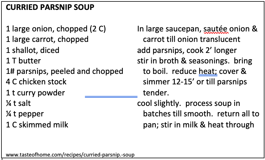 I have enough curried parsnip soup in the fridge to provide a soup course. No animal products were used in its manufacture. I had vowed to shy away from any Indian recipes, but this was an English recipe.