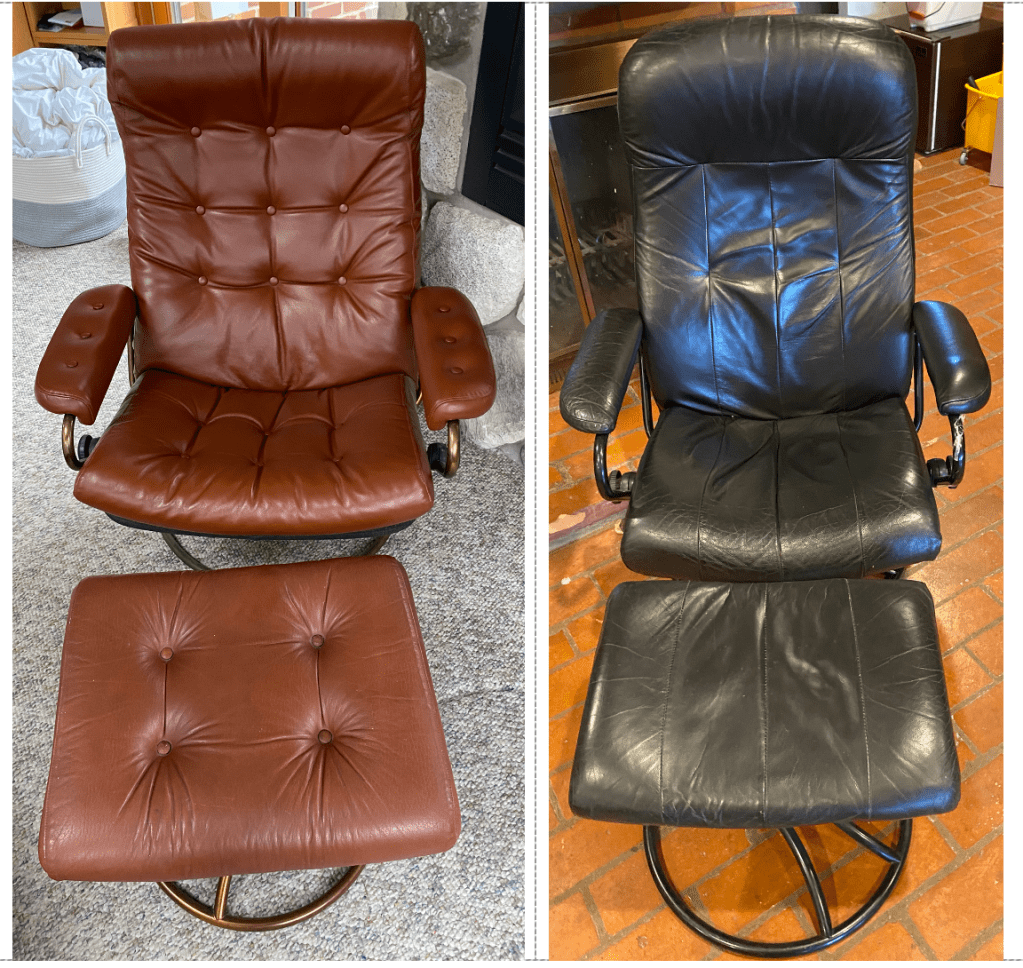 You never know what you’ll find on e-bay. And one day I found another Ekornes Stressless Recliner, this one in blue leather. I couldn’t resist. There would be a place for it. When it arrived, there were some flaws. Up against my ’82 piece, there were some flaws there too, mostly wear and fading. Looking for someone who could effect the necessary improvements, I came across Bar (for “Barbara”) in Chicago who took on Scandinavian leather furniture for a living (4). After a prolonged effort, stretched out by COVID, she returned to me two like new chairs. I am eternally grateful.