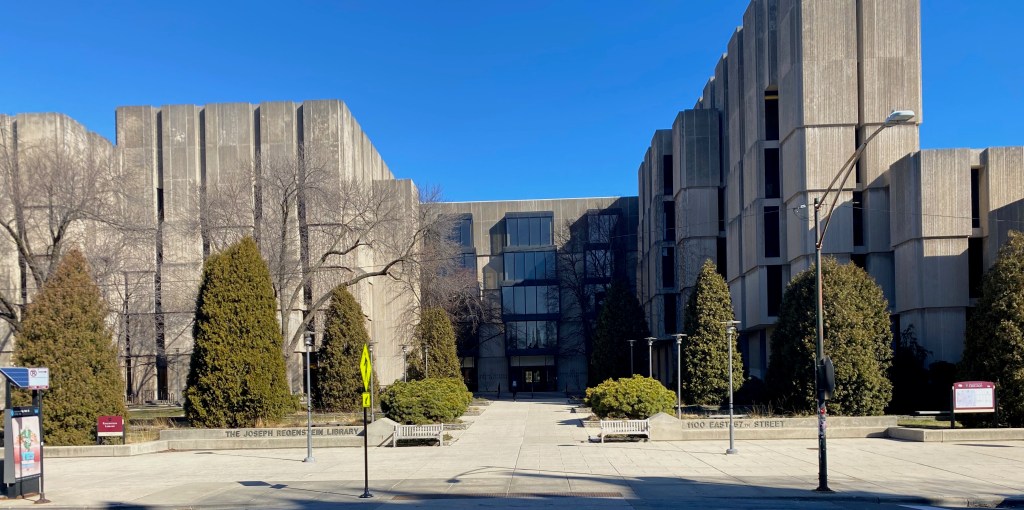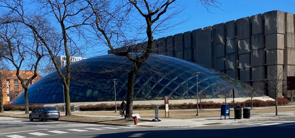 Past 57th, you enter hallowed ground. This now has been consumed by libraries, both Regenstein and the modernistic Mansuetto, looking like something they might construct on the surface of Mars for long term survival of the astronaut crew.