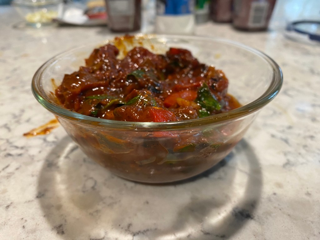 Here’s a peek at what the stuff looks like, some leftovers from breakfast in a bowl. But not for breakfast anymore is this. You could make a nice pasta dish (which we have) or spoon it over most everything.