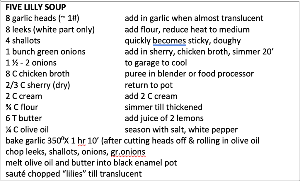 My favorite restaurant in Ann Arbor, the much-missed Lord Fox, where Henry Ford and his henchman Harry Bennett used to ride their horses for Sunday supper, once had a special soup on the menu “Five Lilly Soup” (4). Betty, the proprietress, told us a little about it, including the close relationship of the five main ingredients – onion, garlic, scallions, leeks, and shallots – all in the lilly (allium) family. Garlic (allium sativa), had the most notorious non-lilly relative, that ever popular five-leaved fellow with the same last name. Besides the fact they both stink, the two plants have quite a few chemicals in common (5). I worked to make my own recipe, and think I ended up with something pretty close.