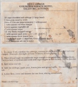 Red cabbage. Both the Dutch and German-English sides of my adoptive family were big fans of red cabbage. I always ate some dutifully but was disappointed it didn’t taste near as good as it looked. Some years ago, I acquired a recipe in response to a radio announcement (I forget the program), and it’s been a hit ever since. Feels good to place it on the table and think about all those family dinners of my youth.
