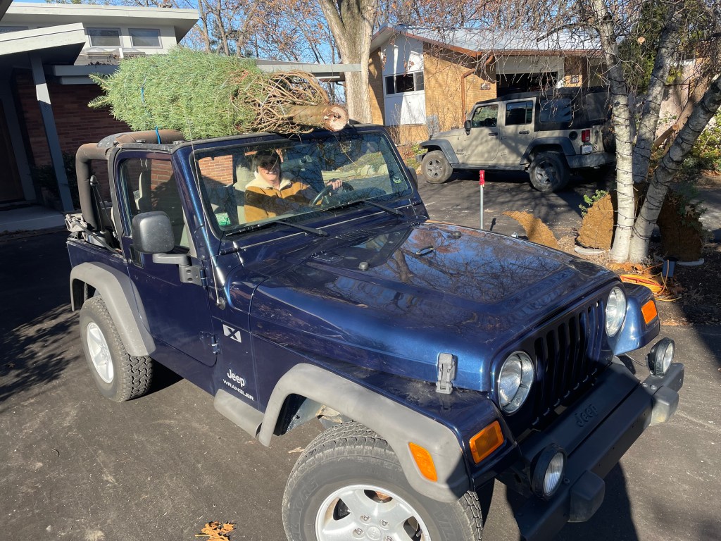 Come Friday, I was facing a pretty easy Thanksgiving dinner prep. Can you call them leftovers if no one’s touched them yet? My giblet stock had had a chance to cook. I didn’t put it up yesterday until I emerged from my nap, about the same time the duck-is-done timer was going off. That stuff should go at least an hour, and is critical to the gravy, so I was looking at a shortchange right there. Sleeping on this meal was the right thing to do. And why not extend the feeling of Thanksgiving? I know the day after has been given over to rapacious capitalism and often violent combative pursuit of bargains, but the only shopping we ever do this day is for our Christmas tree, and maybe some more beer. That morning outing at Braun’s Tree Farm, a mere 4 miles from here, seeking out and cutting down the perfect tree in the brisk late fall air provided us with something we lacked yesterday: an appetite! See us arriving home with our 9’ concolor fir bounty. Our 2-dr ’16 Wrangler is the only of our 2 cars that can handle a big tree (the 4 dr Wrangler is also a soft top, but lacks the buttresses on which to bind a tree). 340 and sunny is fine convertible weather. As our Norwegian ancestors said “there is no bad weather, only bad clothes”.