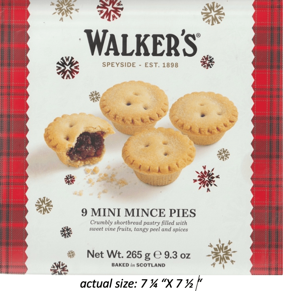 Dessert. Here I cheated. Since Kathy lost her sweet tooth several years ago, she’s not much for desserts of any kind. But that box of Walker’s mincemeat mini tarts caught my eye.