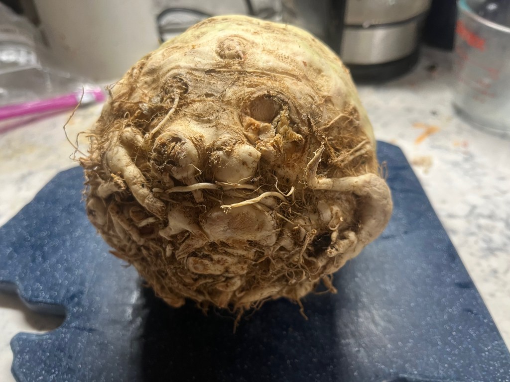 Nearly all threw in some celery, such a common ingredient in soups. But I chose to follow the Dutch into their root cellar and grab some celeriac (celery root). This ball of goodness ain’t going to win any beauty contests. It’s what those stalks grow from, but the root is prized for its flavor, nutritional (even medicinal!) properties (3), and preservabilty.