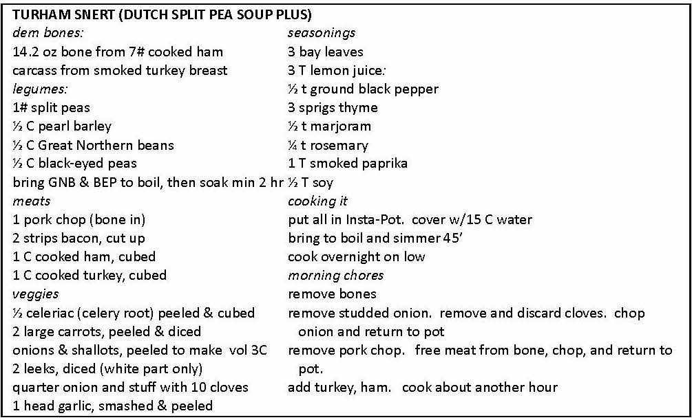 I love it to be presented with a castoff I can turn into yet another taste treat. You’ve seen what happens with duck and turkey cast-offs (1). This week found me receiving more bounty. Kathy liked my brined turkey breast so much it was gone quickly. So when they came on sale at Kroger’s, I picked up another one which is already in the brine same day, smoked the next, and being eaten as I type. Then at Meijer’s the next day, I saw they has big butt hams on sale. I get a lot of mileage out of those, so of course picked one up. The home butchering got some big chunks ready for slicing, some smaller bits ready for snacking or soups, and of course the bone. This being a butt ham, it’s not just a nice smooth femur, but that bone and its articulation with the acetabulum of the pelvis. So I’ve actually got 2 bones. What can you do with them? Oh my! My Dutch soul craves some tasty split-pea soup. But I’m also gonna have this turkey carcass. So this calls for a little creativity. I’ve already landed on a name “turham splt pea soup”. Maybe a little homage to my best friend, Eric Durham. That name got embellished when I learned the Dutch call their soup “Erwtensoep” (pronounced: Air-ten-soup) or “snert” (2). Who wouldn’t want a bowl of snert! But now the recipe! I have 9 recipe cards for split pea soup in my box, all cut out of newspapers and pasted for later use. None by itself seems right for this project, so I do what I always do confronting a new recipe, make a spreadsheet! From this I can discern trends and pick and choose what I want in my recipe. I added a 10th column for my recently discovered “true” Dutch split pea soup.
