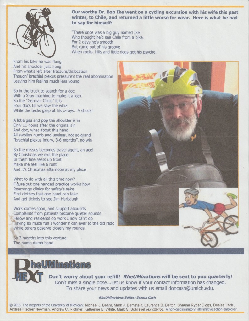 - Ike B. Reflections on a cycling excursion in Chile. RheUMinations Spring 2015.