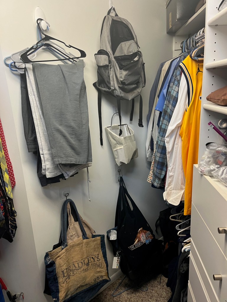 Back upstairs, let’s turn to the master bedroom. A blank wall in my walk-in closet becomes a repository for a resting place for laundry I’m too lazy to hang, frequently used shopping bags, my backpack, my CPAP case and frequently used power tools, and a basket to collect most anything I don’t know where else to put.