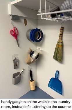 First stop is the laundry room, where the seldom-attended counter attracts clutter. Fie to that, as up on the wall it goes!
