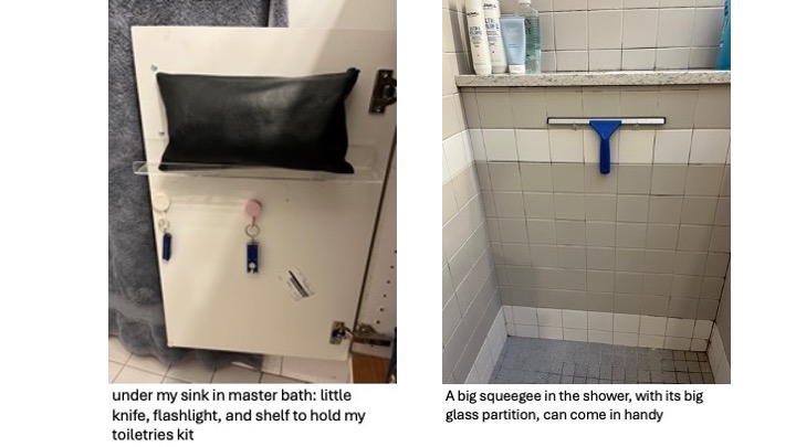 Off now into the living room. Next to my Ekornes Stressless Max recliner (3) in the living room – my “office” – come 2 little hooks that support my head magnifier, headlamp, little flashlight, and reading glasses. Just to the left hang our Oontz speaker and string bag that acts as my accessory wastebasket (it’s such a long walk across the room to our main one!). There’s more around the corner. Kathy has followed suit.