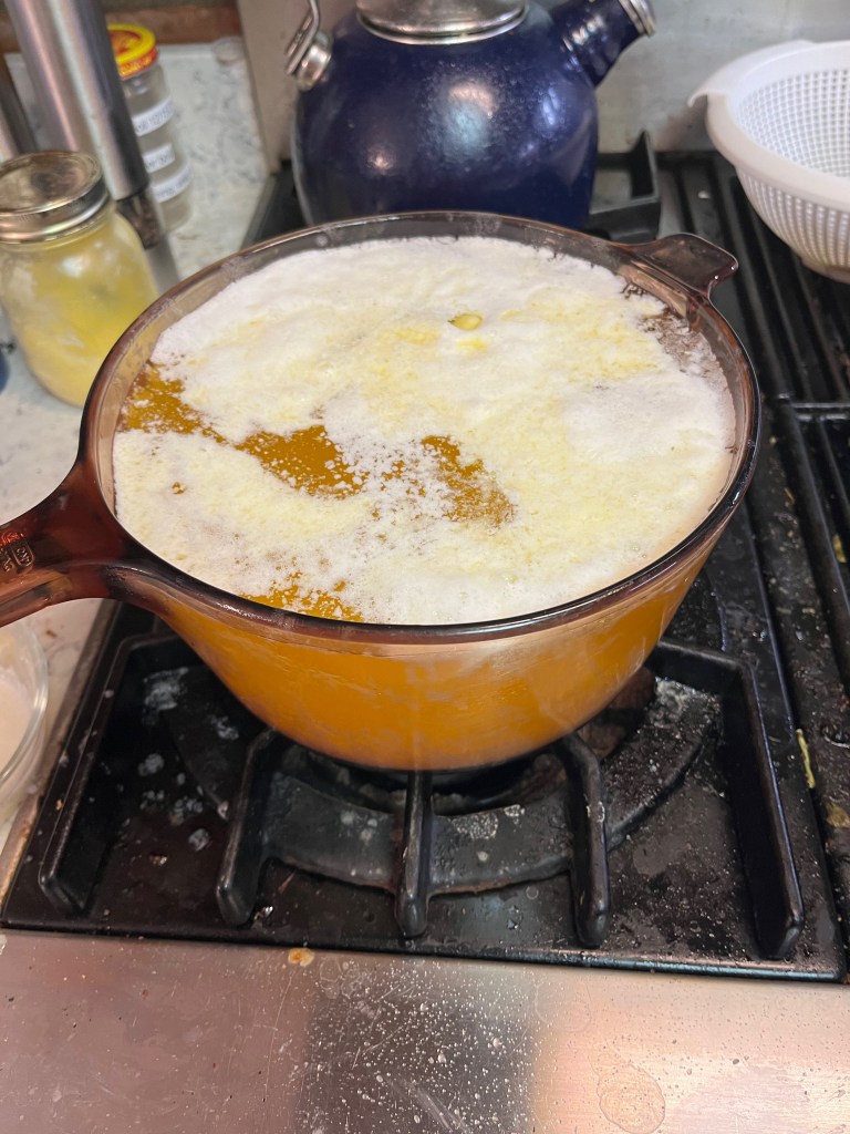 Of course, it takes a lot longer for 5 pounds of butter to melt than it does one pound. Idle time for the chef to sit back and sip at his companion beverage. The foam roars up like slag on an open-hearth steel furnace and must be skimmed with a spoon.
