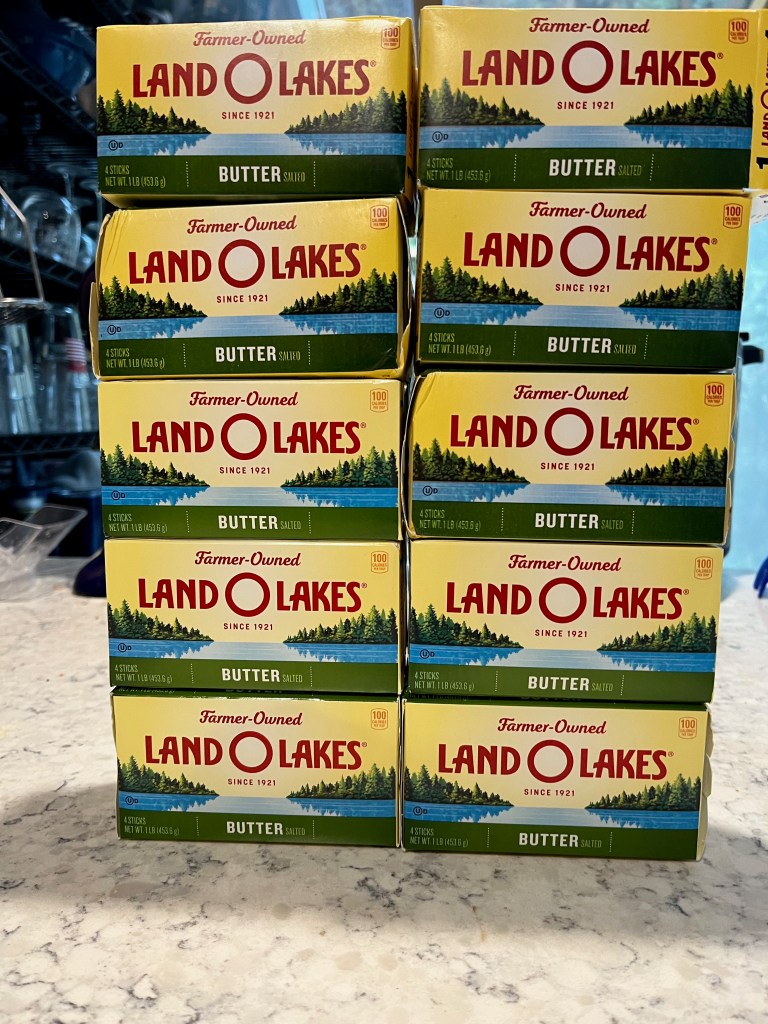 It began as something for the Spei family mid-February Christmas celebration extravgangza. The February date allows individuals to have their close family Christmas then be available sometime after Valentine’s Day for a bigger blowout. My birthdad, Dick Spei, was a gourmet/gourmand who taught all his offspring to approach each meal as if it were their last, advice heeded by all out to a couple generations now. With a little friendly competition, an enormous spread is produced – from old family recipes to new experiments – that takes 3 days to consume, always with leftovers for all. There are no big gifts, even with all the rugrats running around. Small individual gifts come out of the “Chimney”, in a ritual orchestrated by my sister Suzanne (1). Little foodie gifts go to the adults, anything from an interesting useful utensil to an array of homemade concoctions. I finally joined the fray a few years back and decided to continue my participation this year. I’d been pleased with the ghee I’d been whipping up (2) and wondered to my #1 nephew Jake – who’s the main organizer of the event – how little jars of that might be received. Excellent idea, said Jake. I’d start with 10# of butter and see what I got. Even though plans were set weeks in advance, I didn’t get around to executing them till the days before the event. Fortunately, Kroger had a nice sale on Land o’Lakes, $3.99/#, almost half price. But to get that price you had to scan a QR code to make an electronic coupon. Thus, I had to download and learn a new app, then go to the store on successive days because the limit was 5/customer. But the haul made for an impressive stack.