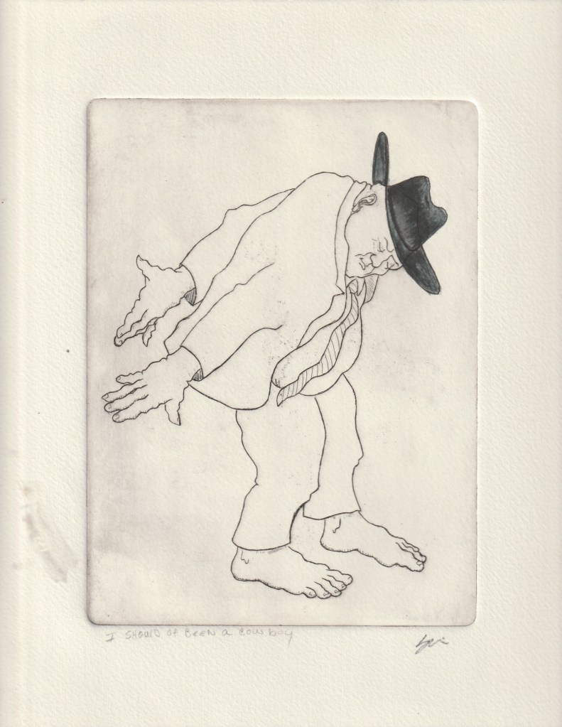 And Marty spread out some of his etchings to take, and I snagged one Sunday morning. Full size is 9 3/16 X 11, and the caption reads “I should of been a cowboy”.
