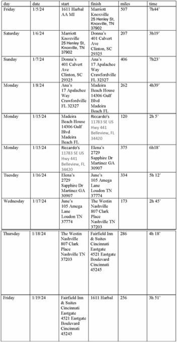 I’ll tell you more about Madeira Beach later. Back to the trip that just happened. Getting to MB is easy. The flights from DTW to TPA are plentiful and relatively cheap. We can always get a Jeep through Turo (3), and the only pain is fighting the traffic for 25 miles on the Bean Parkway over 3 bridges to the Beach. After last year’s stay, we thought maybe we’d drive down next time. Come November, that still seemed like a good idea. Friends from Michigan, New Mexico, and Colorado had moved to places in Dixie where we could touch down along the way. Kathy’s 89-year-old Uncle Chuck was the Ohio River away from Dixie in Cincinnati – still right off 75 – and our 18-year-old niece Ayslin was a junior at Vanderbilt (home schooled). Just like last year (4), Jimmy Harbaugh complicated our January vacation plans by putting the team in the championships, but we could watch that game from somewhere in MB. As we worked our way down, complications ensued. Chuck’s Kathy was medically indisposed and wouldn’t be good company, so we passed Cincinnati by. We were expecting to land with June, in Loudon outside of Knoxville. She didn’t return a couple of my warning e-mails, but we proceeded, nonetheless. We caught up with her about an hour out. She was driving north from her daughter-in-law’s in Florida. No meet up this time! We camped in a nice Marriott in Knoxville (on points!) and moved on to South Carolina to find Donna.