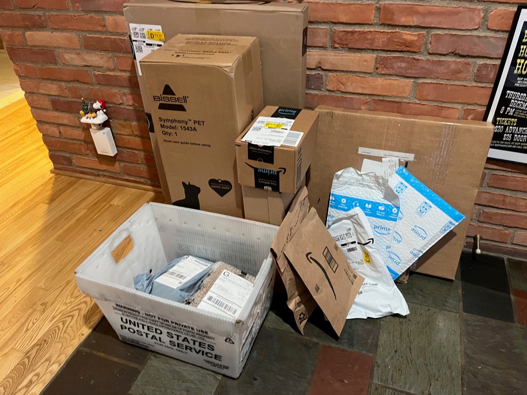 Coda: When we pulled up to the driveway at about 2:45 PM Friday, 2 weeks after we’d left, all looked intact, our beloved house looking inviting with its snowy highlights. No packages on the porch, indicating our neighbors had indeed been vigilant, although an Amazon driver would walk up and hand us another one while we were unloading. Our neighbor Tom, responsible for all the vigilance, had texted Kathy that he could no longer work the keyless entry pad on our front door. We’d been having trouble with it for a couple weeks. We figured, o.k., we’d get in through the garage. Imagine our surprise when the keypad on the door to the kitchen from the garage wouldn’t work either. Apparently, its battery went dead. Undaunted, Kathy had me carry our extension letter to the back, where we propped it up to the deck railing by the hot tub, and she scurried up to the deck finding the sliding door to the sunroom, as closer doors to our bedroom and the living room were locked. After a quick tour of the interior to assure all was well, we threw open both doors to the outside and unloaded. Another Christmas awaited us with all the packages and held mail.