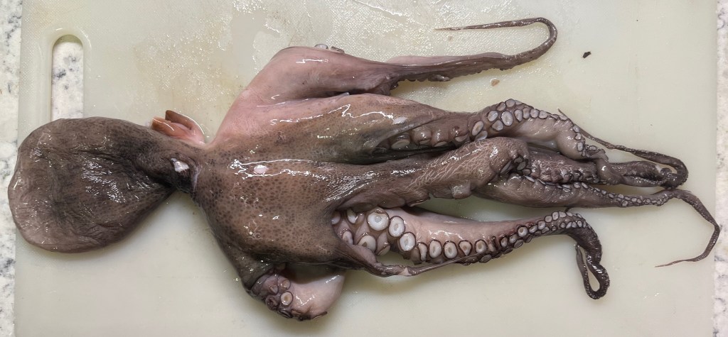 I bought my first octopus day before I first wrote this. With the Stanley Cup far off and our Wings even farther, we decided to eat it. It’s very clear you’re about to toss a once living creature in the pot.