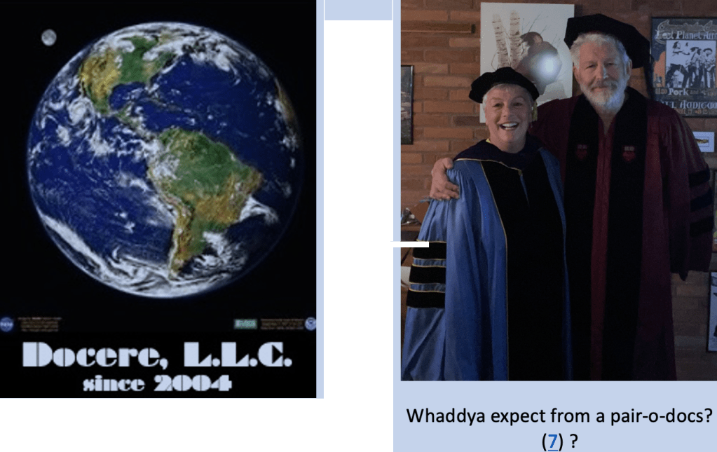 My dear wife flew pretty high around the turn of the century as NASA’s Chief Scientist, an experience that informed the motivationql speeches she took to giving after her tenure there.  To handle the proceeds from her efforts, she formed an LLC, Docere (doh-kaý-rah; from the Latin “to teach”).  Over the years, we’ve taking to running any gains made from education (besides our U paychecks) through the company.  6 months into my retirement, she agreed to name me co-CEO.  I commemorated that day with a brief post that remains one of my most popular (1).  Made an excuse for ginning up new business cards for the both of us.  What is our main product?  You can tell by our motto, which we stole from Faber College: “Knowledge is good”.  With both of us putting more and more time into writing these days, books have become our main output.  Although one of us (RWI) still cranks out obscure scientific papers,  what we write is mostly lighthearted, and often personal.   And both of us old, retired teachers like to slip in some education when we can.