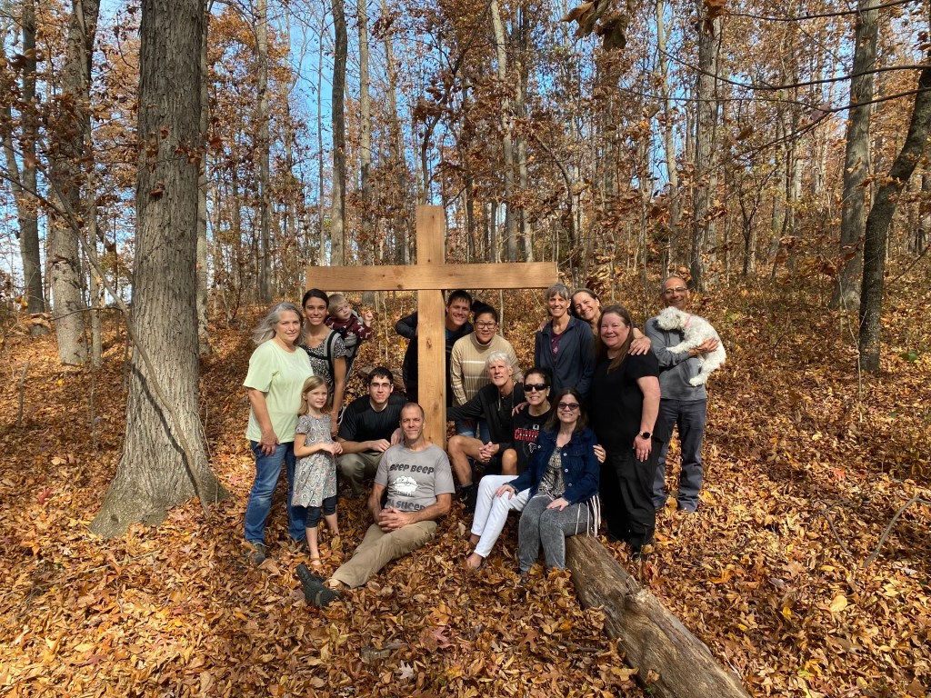 The day following the service, his brothers and sisters and theirs who had come for the funeral took advantage of the bright sunshine to gather at a special place in the woods near Terry’s home. It was here when in a wood cutting expedition by Terry, his brother Rick, and brother-in-law Ken (Linda’s husband), one of the cut trees fell across Ken’s chest, rendering multiple injuries from which he would not recover. Hence Linda was already in deep grief as she watched her brother fade away. Fortunately, their parents had instilled in all their children a deep faith, which each has continued to nurture. Rick, a woodsman in every sense of the word, crafted an impressive cross out of that tree and erected it at the site of the fatal accident. It was there where the clan gathered.