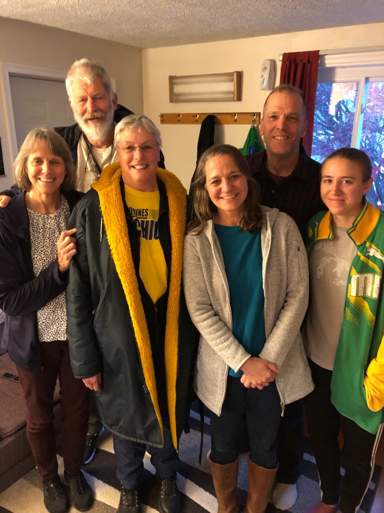 I always wondered what I’d do with those two labels I’d so carefully soaked off a couple of magnificent bottles of booze from many Christmases ago. They rested in a plastic basket next to my blue recliner amongst all the other stuff I didn’t know what to do with. With my unexpected but wonderful reacquaintance with my Arlington rugrat cousins (1), a big window opened. My late Uncle Jim had a real thing for nicknames and all his kids had one. See my wife and me with 3 of them at cousin Linda’s Arlington house Saturday before last: