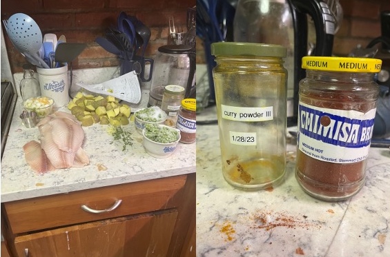 The counter takes its toll. No goat there (that’s for another day). Ya go through a lot of Curry Powder. A little hot powder helps, so from Mexico we dig out some some Chimisa.