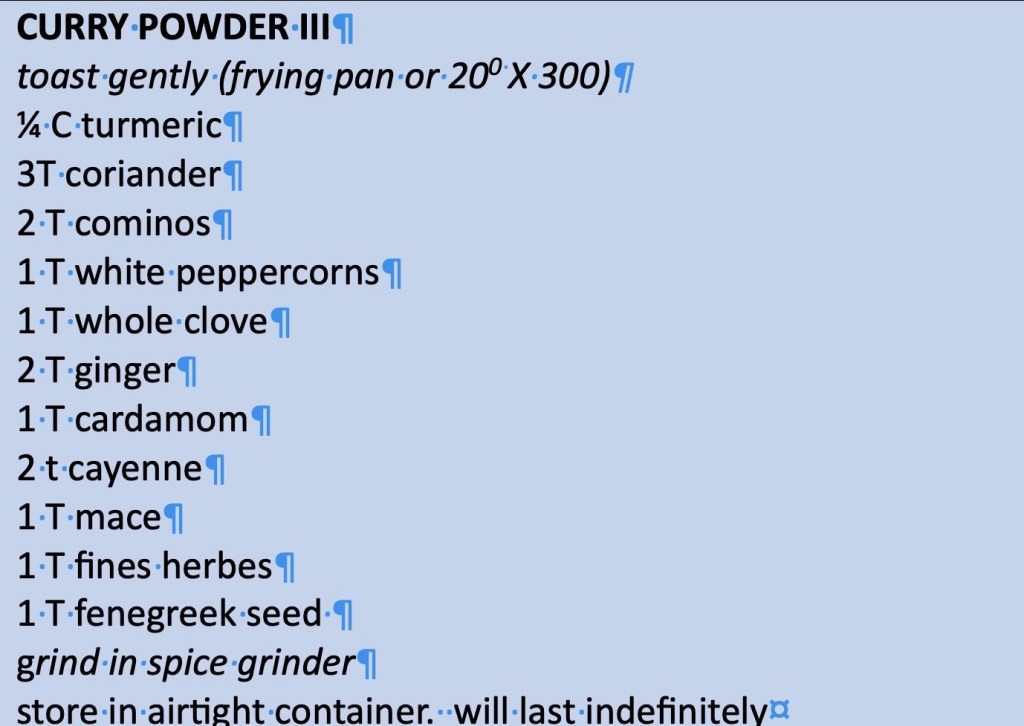 The counter takes its toll. No goat there (that’s for another day). Ya go through a lot of Curry Powder. A little hot powder helps, so from Mexico we dig out some some Chimisa and some curry power III toast gently (frying pan or 200 X 300)¼ C turmeric3T coriander2 T cominos1 T white peppercorns1 T whole clove2 T ginger1 T cardamom2 t cayenne1 T mace1 T fines herbes1 T fenegreek seed grind in spice grinderstore in airtight container. will last indefinitely